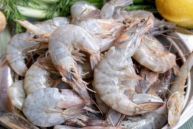 Близкий план сырых креветок, лежащих на подносе с овощами