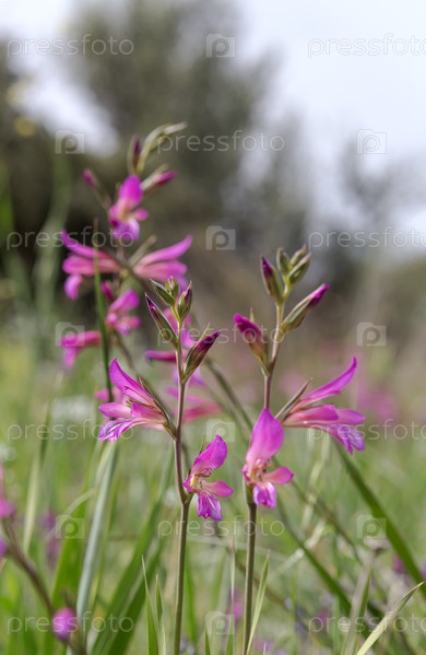 Дикий гладиолус (Gladiolus communis) растет на лугу в солнечный весенний день