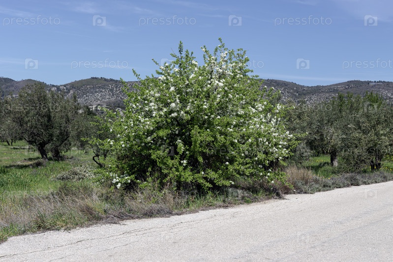 Груша (Pyrus spinosa) растет и цветет у дороги