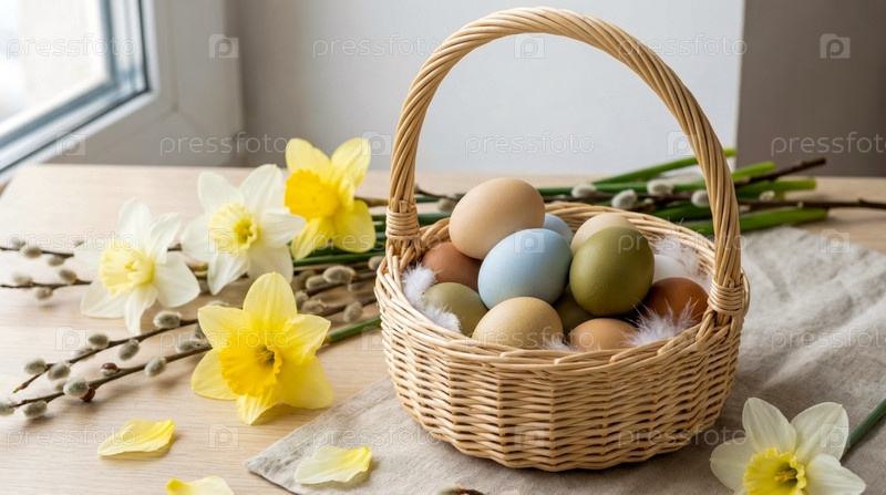 Пастельные яйца в корзине с желтыми нарциссками