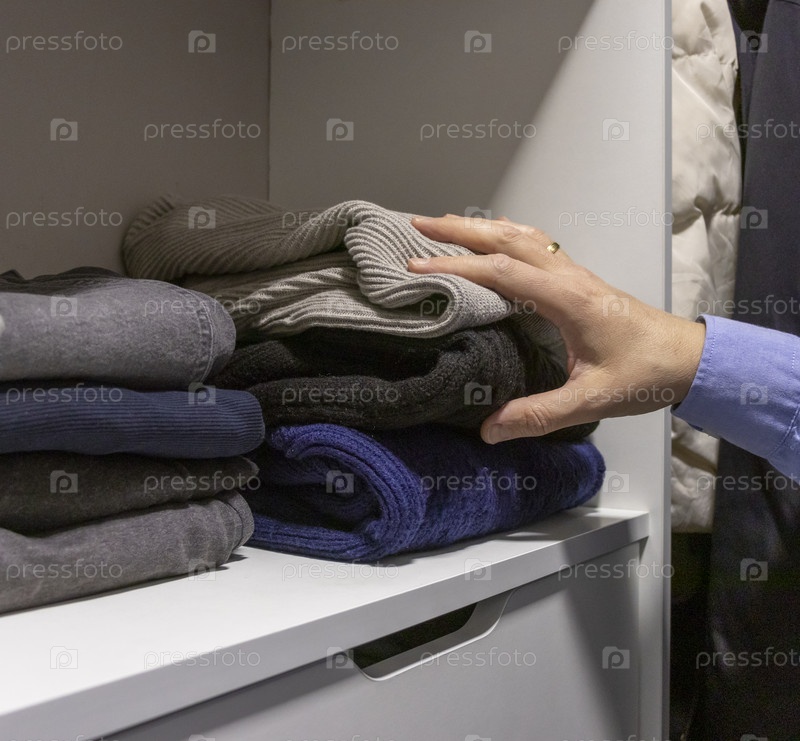 Мужчина выбирает свитер с полки со стопкой сложенных джинсов и повседневной одежды