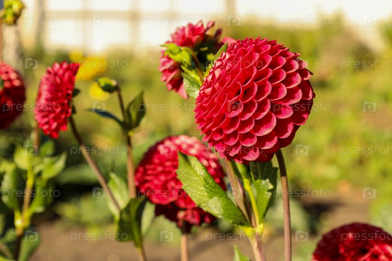 В саду цветут ярко-красные помпонные георгины