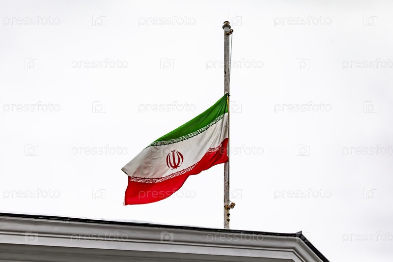 Приспущенный во время траура флаг Ирана на флагштоке на крыше здания посольства