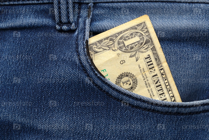 Угол одной-долларовой банкноты вытягивается из кармана синих джинсов