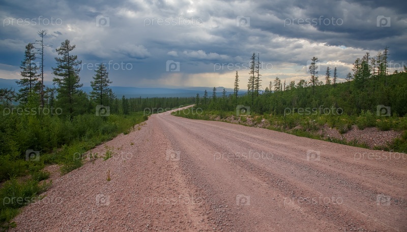 Грязная дорога в горах Южной Якутии вечером при плохой погоде