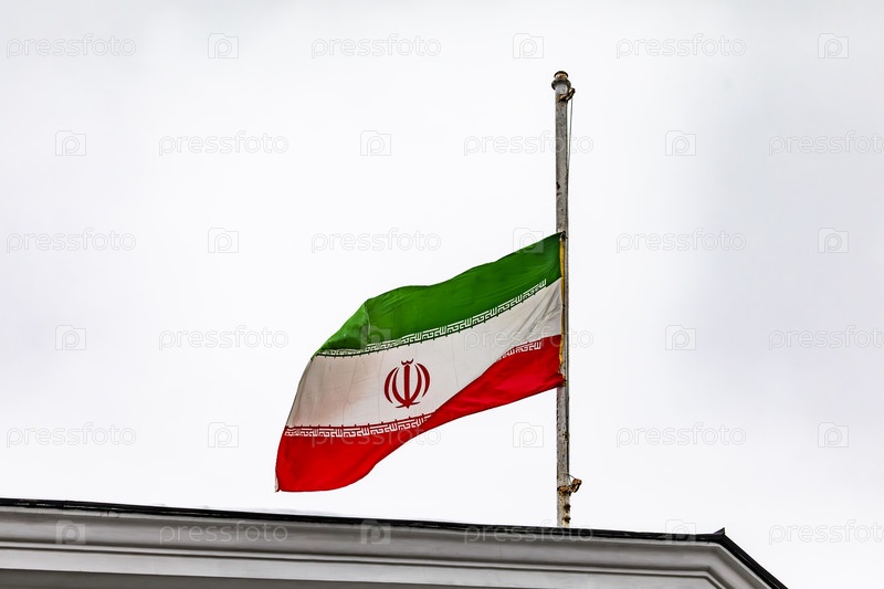 Приспущенный во время траура флаг Ирана на флагштоке на крыше здания посольства