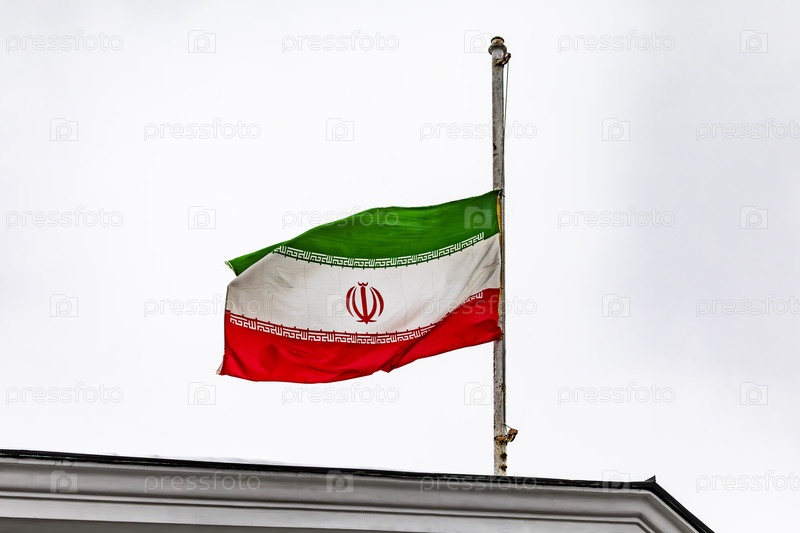 Приспущенный во время траура флаг Ирана на флагштоке на крыше здания посольства