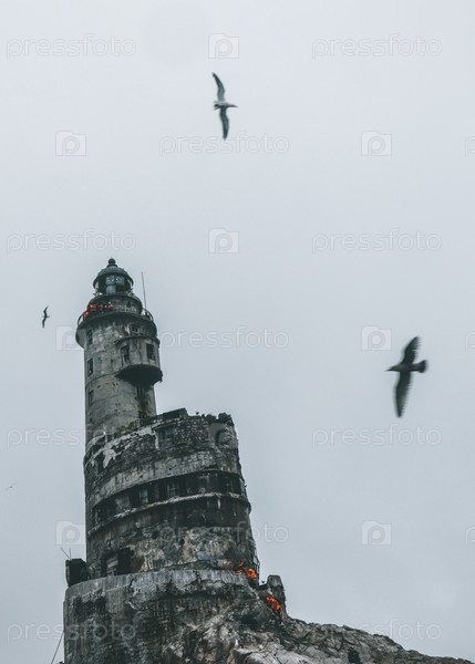 Маяк Анива и чайки на острове Сахалин