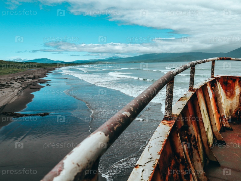 Вид на набегаюшие волны с кормы заброшенного корабля на острове Итуруп