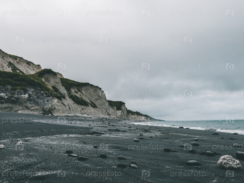 Черный песок морского побережья Охотского моря на острове Итуруп, Курилы