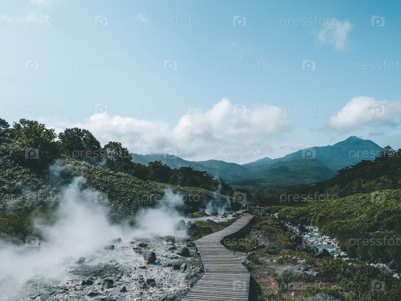 Пешая дорожка среди паров термального источника на острове Итуруп, Курилы