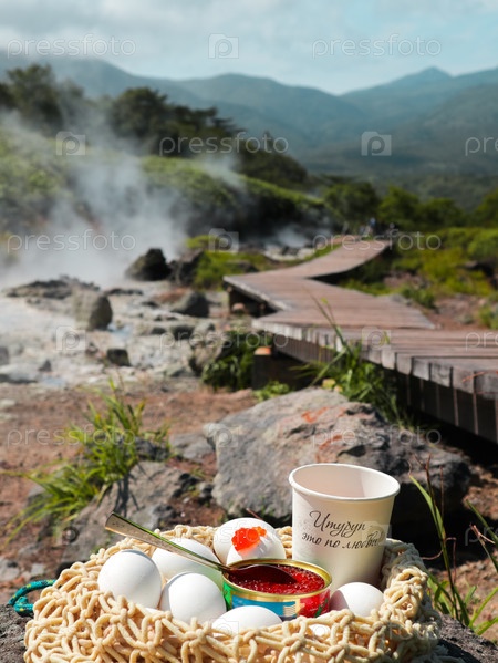 Туристический завтрак на термальном источника острова Итуруп, Курилы