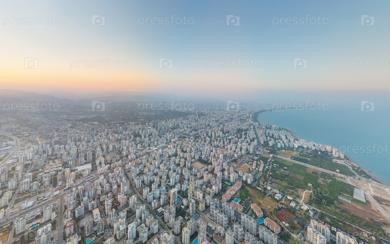 Панорамный взгляд с воздуха на жилой район Мезитли вдоль берега Средиземного моря Песчаные пляжи, многоквартирные дома и море под рассеянным дневным светом