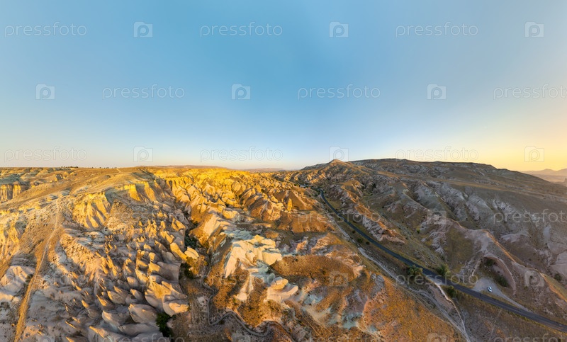 Широкий панорамный снимок беспилотного летательного аппарата долины Деврент (долина воображения) с эродированными вулканическими туфовыми образованиями, закрытыми колоннами и текстурированной местностью на закате