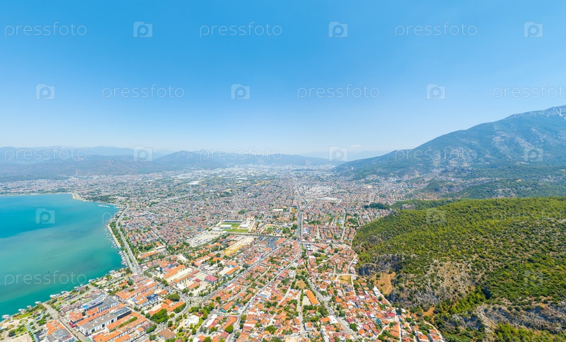 Панорамный воздушный снимок бухты с набережной, современного города и далеких ликийских скальных гробниц в скалах