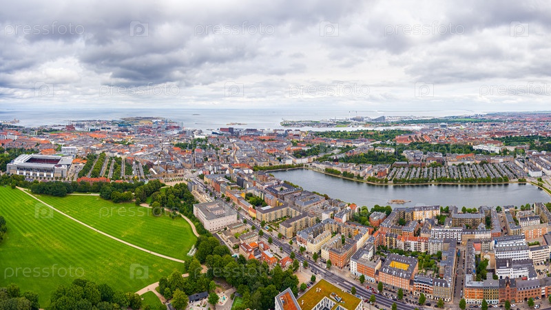 Копенгаген, Дания. Район Нордхавнен. Озера Копенгагена. Панорама города летом. Облачная погода. Вид с воздуха