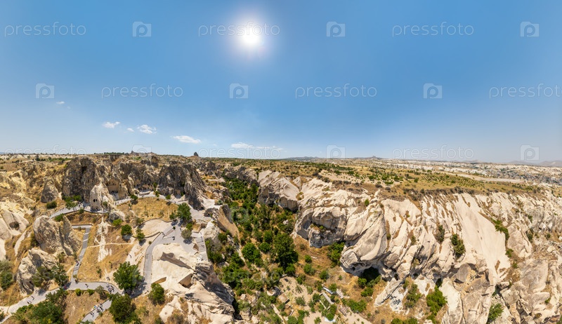 Широкая панорама с воздуха, демонстрирующая вырезанные в скале сооружения и пещерные жилища музея Goreme Open Air Museum на фоне драматической долины Каппадокии