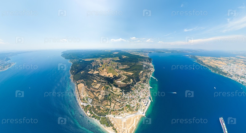 Замок Килитбахир, Бастион Румелии Мечидие и Бастион Намазга на побережье Дарданелльского пролива с грузовым судном и паромными лодками, города Килитбахир на заднем плане