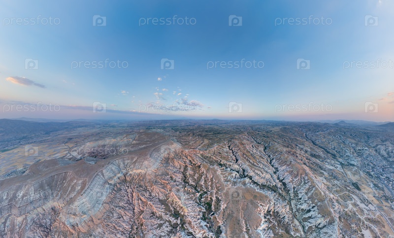 Большая панорама высоких плато Каппадокии с возвышенными рельефами, простирающимися до горизонта, с нежным розовым вечерним светом и рассеянными облаками