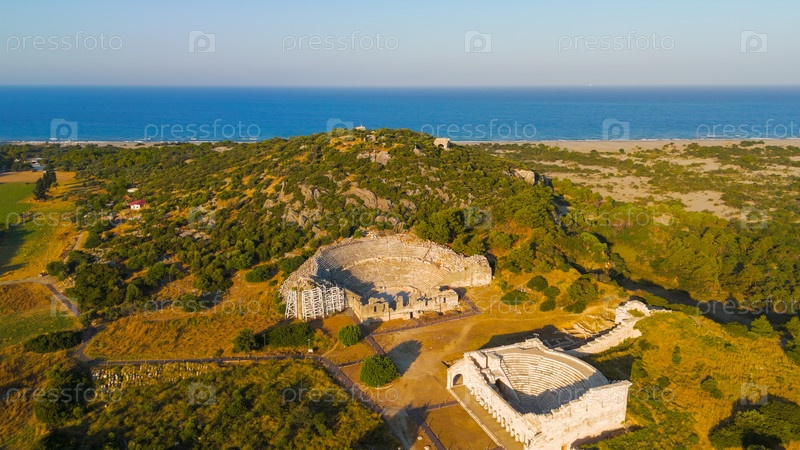 Гелемис, Турция.Древний театр Патары на холме Курсунлу, археологический памятник столицы города Ликии в летнем утреннем свете