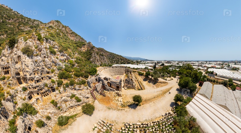 Дизайн древнего амфитеатра и скалистых гробниц с видом на обширные пространства белых теплиц