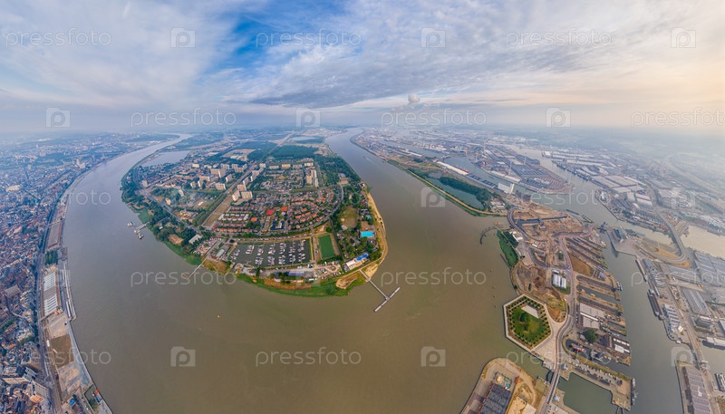 Антверпен, Бельгия. Панорама города. Река Шелда (Эскаут). Летнее утро. Вид с воздуха