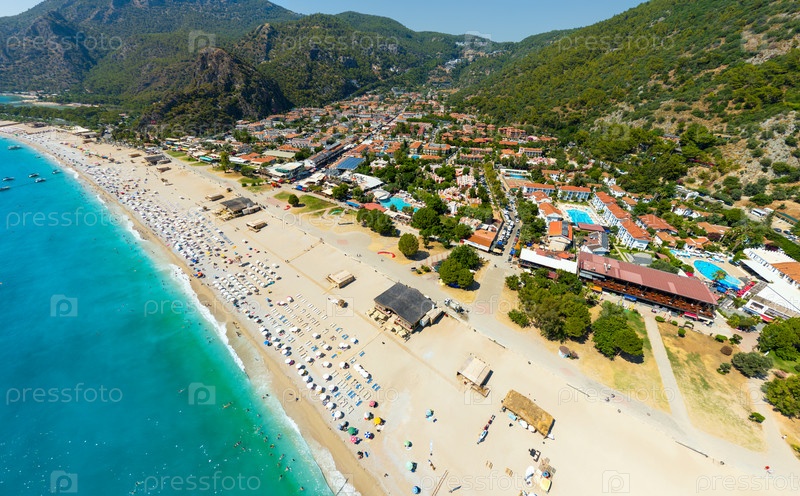 Семейный пляж с безопасной зоной для купания, дети играют, родители отдыхают под зонтами, доступные тропы и кафе с видом на горы летом