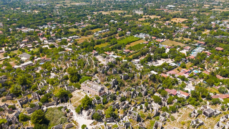 Каякой, Турция.Авиационный вид с дронов Верхней церкви (Panagia Pyrgiotissa) среди заброшенных руин города-призрака на склоне горы под ясным небом