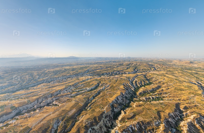 Широкий панорамный взгляд с воздуха на плато Каппадокии, расчлененное эродированными долинами, с скальными образованиями и волшебными дымоходами под ярким утренним солнцем