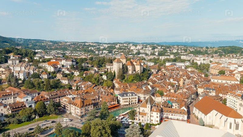 Аннеси, Франция. Замок Аннеси. Исторический центр города с рекой Тиу. Аннеси - город в Альпах на юго-востоке Франции, Aerial View