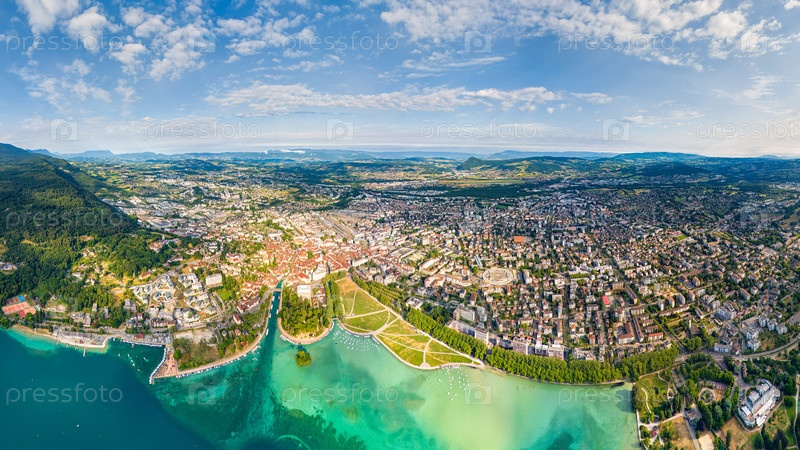 Озеро Аннеси с окружающими горами и деревнями Панорама летом Французские Альпы Вид с воздуха