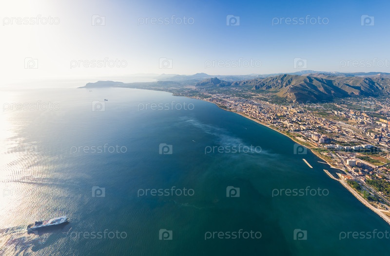 Палермо, Сицилия, Италия. побережье в городе с кораблями. солнечный летний день. вид из воздуха