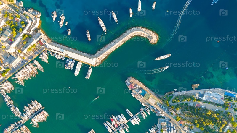 Вид сверху вниз из дрона на Bodrum Marina Вход, причалы с яхтами и парусными лодками аккуратно расположены в рядах