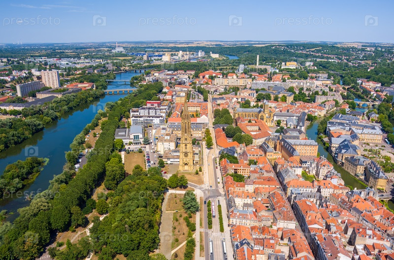 Мец, Франция. колокольня - Tour du Temple de La Garrison de Metz Панорама города в летний день Солнечная погода Вид с воздуха