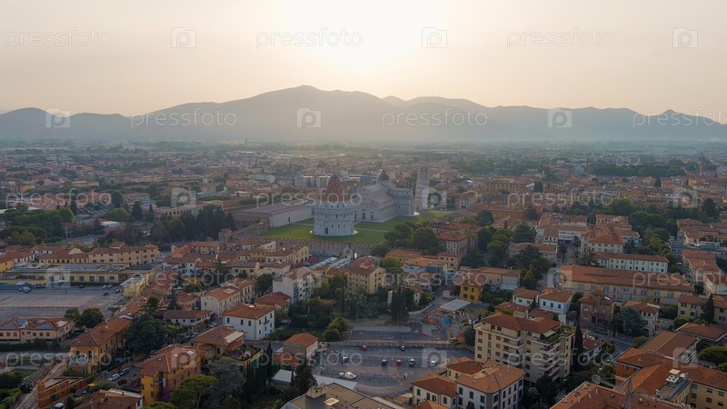 Пиза, Италия. Знаменитая наклонная башня и пизанский собор в Пьяцце деи Мираколи. Лето. Утренние часы, взгляд с воздуха