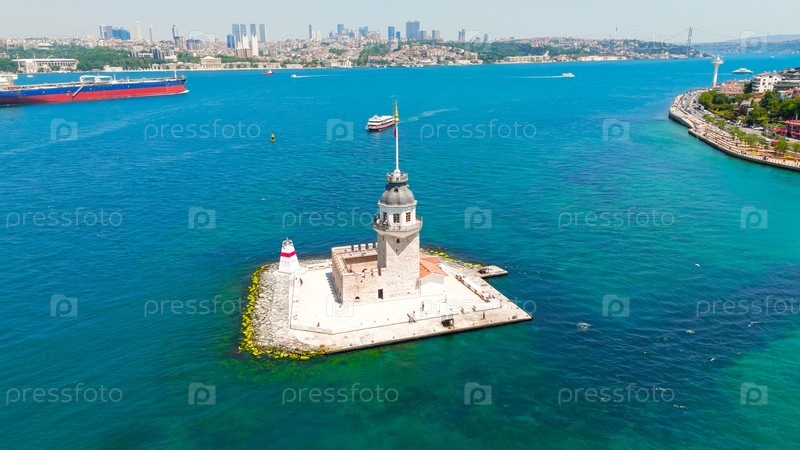 Историческая девственная башня Kiz Kulesi на скалистом острове в Босфоре с водными такси и небольшими лодками, проходящими мимо в солнечный день