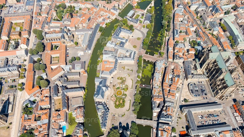 Метц, Франция. Река Мозель. Вид на исторический центр города. Лето, солнечный день, Aerial View