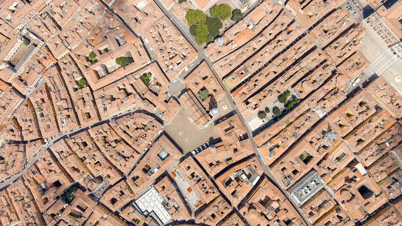 Модена, Италия. Собор Модены. Знаменитый романский собор с колокольницей. Исторический центр. Летом, взгляд из воздуха