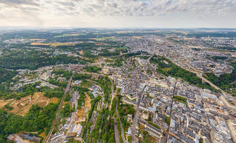 Люксембургский город, Люксембург. Панорама города. Летний день, облачная погода. Вид с воздуха