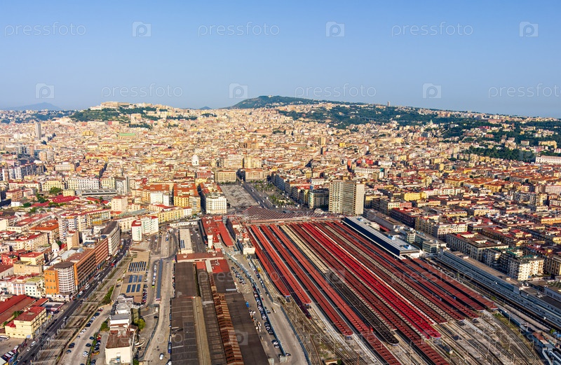 Неаполь, Италия. Железнодорожный вокзал - Napoli Centrale. Панорама города в летний день. Солнечная погода. Вид с воздуха