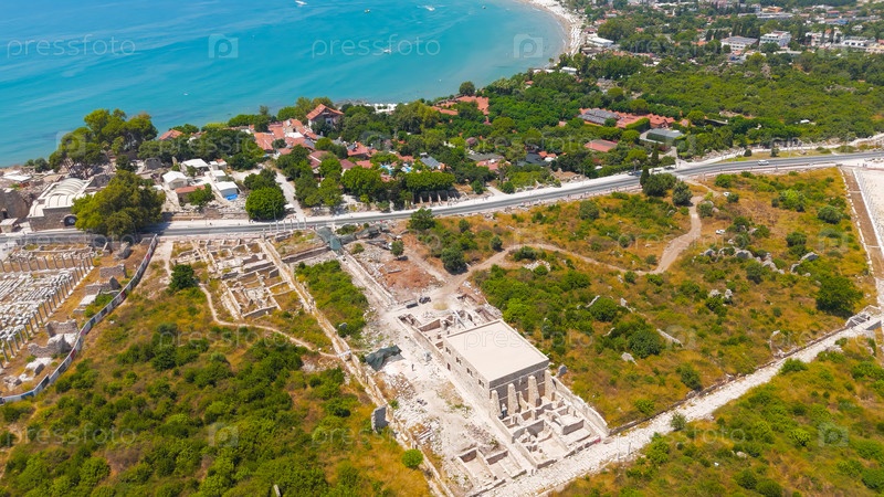 Сид, Манавгат, Турция.Древняя византийская больница, археологический участок Колоннированная дорога, панорамный взгляд с воздуха на раскопки в древнем городе в летний день