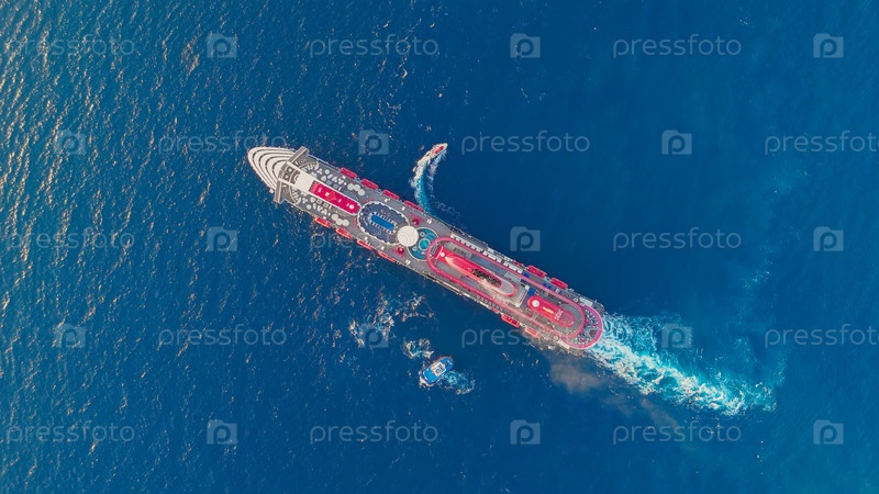 Кусадаси, Турция. сверху вниз круизный корабль маневрирует в бухте. снимок показывает бассейны, солнцезащитные комнаты и воронки против воды