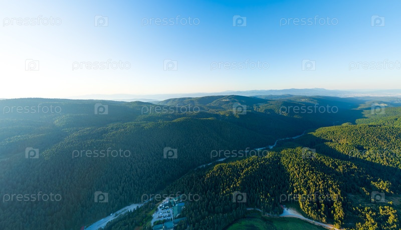 Абант - большое пресноводное озеро, окруженное горами и лесом с живописным видом. время захода солнца. летний пейзаж. вид из воздуха