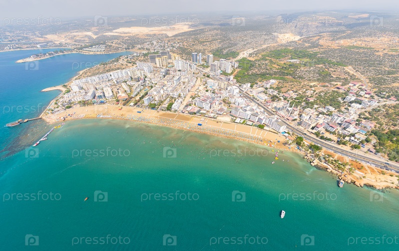 Кизкалеси, Мерсин, Турция. воздушный снимок оживленного городского пляжа с переполненной водой, плавателями, зонтиками, золотым побережьем и средиземноморской береговой линией