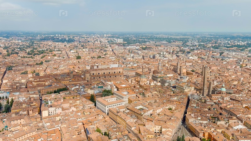 Болонья, Италия.Старый город.Базилика Сан-Петронио, Пьяцца Мажоре.Панорамный вид на город.Летом, Aerial View