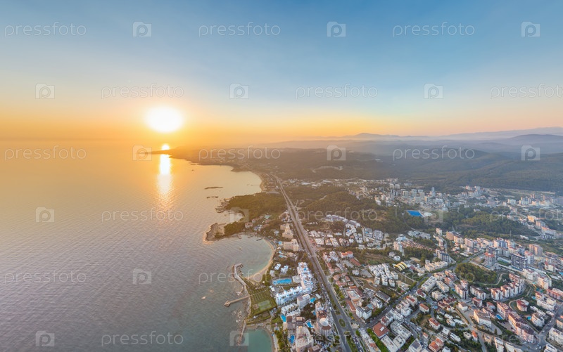 Прекрасная панорама заката солнца над горами Тельца, прибрежными сосновыми лесами и блестящим Средиземным морем