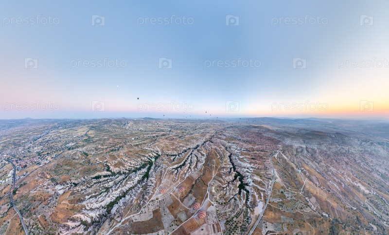 Широкий панорамный вид воздушных шаров в сумерках перед восходом солнца с мягкими розовыми и оранжевыми оттенками над плато Каппадокии