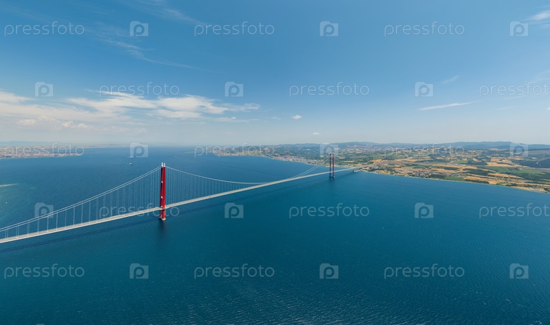 Лапсеки, Турция.Авиационный вид 1915 года Мост Чанаккале, соединяющий Европу и Азию через Дарданелльский пролив.Символический мост с диапазоном 2023 м для столетнего юбилея.Вид с воздуха