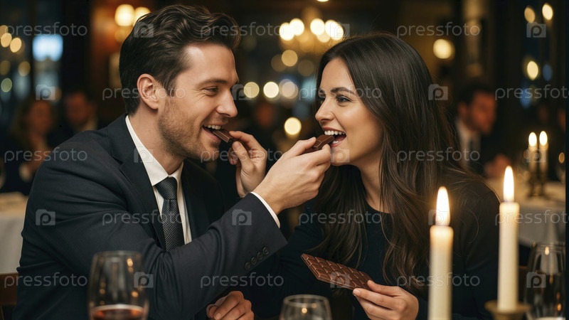 Романтическое разделение шоколада в ресторане изысканной кухни