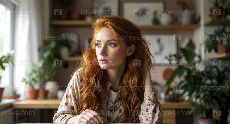 Пенсивная рыжеволосая в уютной домашней обстановке